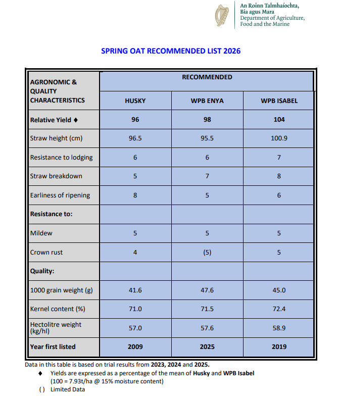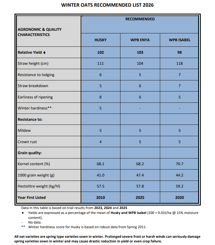 See the DAFM website for more details Winter Oats Recommended List