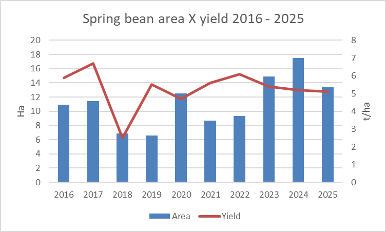 The 10 year average area of spring beans is 11,200 hectares, ranging from 6,600 ha in 2019 to 17,400 ha in 2024. This variation is influenced by the protein payment available and other spring crop options.